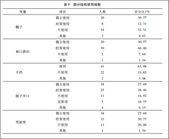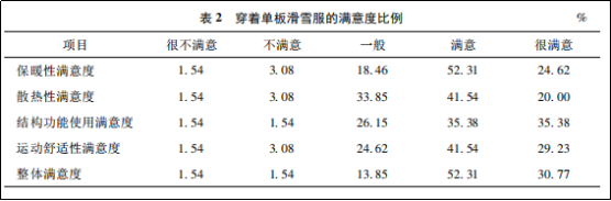 接下來作者從“保暖性滿意度”、“散熱性滿意度”、“結構功能使用滿意度”、“運動舒適性滿意度”、“整體滿意度”五個方面對消費者滿意度進行了調(diào)查。情況如下:
