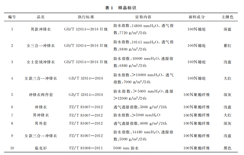 分別從實體店和網(wǎng)絡(luò)平臺購買中端品牌的沖 鋒衣,不同品牌10件,價格區(qū)間在1000元左右。 其中 執(zhí) 行 標(biāo) 準(zhǔn) 標(biāo) 示 了 GB/T32614—2016 的 5 件,未標(biāo)示 GB/T32614—2016而宣稱有防水性 能和/或透濕性能的5件,詳見表1。