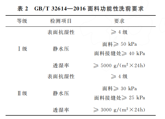 GB/T32614—2016《戶外運動服裝 沖鋒衣》 標(biāo)準(zhǔn)依據(jù)沖鋒衣的功能指標(biāo)對其進(jìn)行了級別劃 分。I級產(chǎn)品的防水透濕要求最為嚴(yán)格,適用于 專業(yè)戶外活動;II級產(chǎn)品相對I級產(chǎn)品的防水透 濕指標(biāo)稍低,可滿足日常的戶外休閑等活動。對 于劃分I級、II級的功能性指標(biāo),應(yīng)在吊牌中標(biāo)注 “I級”或“II級”,不標(biāo)注的均視為I級產(chǎn)品。面料 功能性又分洗前和洗后要求,本文考慮了樣品成 本和比較目的達(dá)成兩方面的原因,只測試和比較 面料功能性洗前要求,見表2。