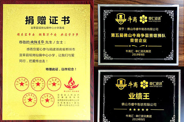 大家看一下下面的獎項就知道睿牛制衣還是個不錯的良心企業(yè)也是一家有實力的沖鋒衣生產(chǎn)廠家,我們的總經(jīng)理同時也是非常有愛心的,她經(jīng)常做善事來匯報社會,因為她 出生在70年代從小的生活也是很艱苦的,他非常能夠理解學生渴望讀書的那種心情,所以我們老板歐陽月華女士特地愛心參與捐贈宜章縣瑤崗仙鎮(zhèn)中心小學落成,凝聚萬千愛,共圓心學子夢!還有我們總經(jīng)理系上絲帶的照片,讓大家共同把愛傳遞出去!