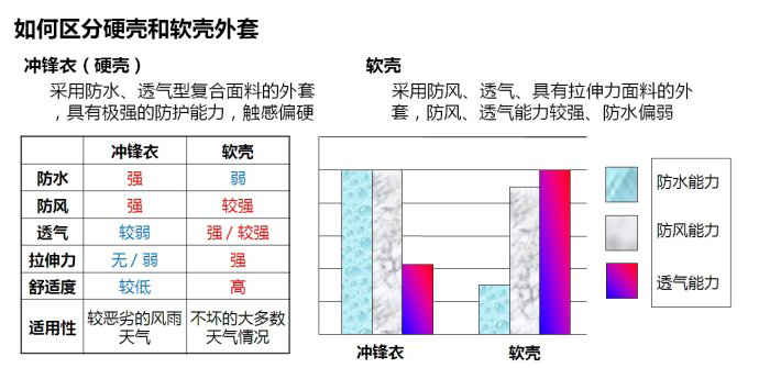 下面從一張圖區(qū)別硬殼軟殼沖鋒衣,簡單來說硬殼更加戶外專業(yè),功能性更強(qiáng),適合戶外活動穿;而軟殼是在原有保暖防風(fēng)面料上增添一個防水層,功能性差一些,但同樣具備防水性能,適合日常交際穿著。