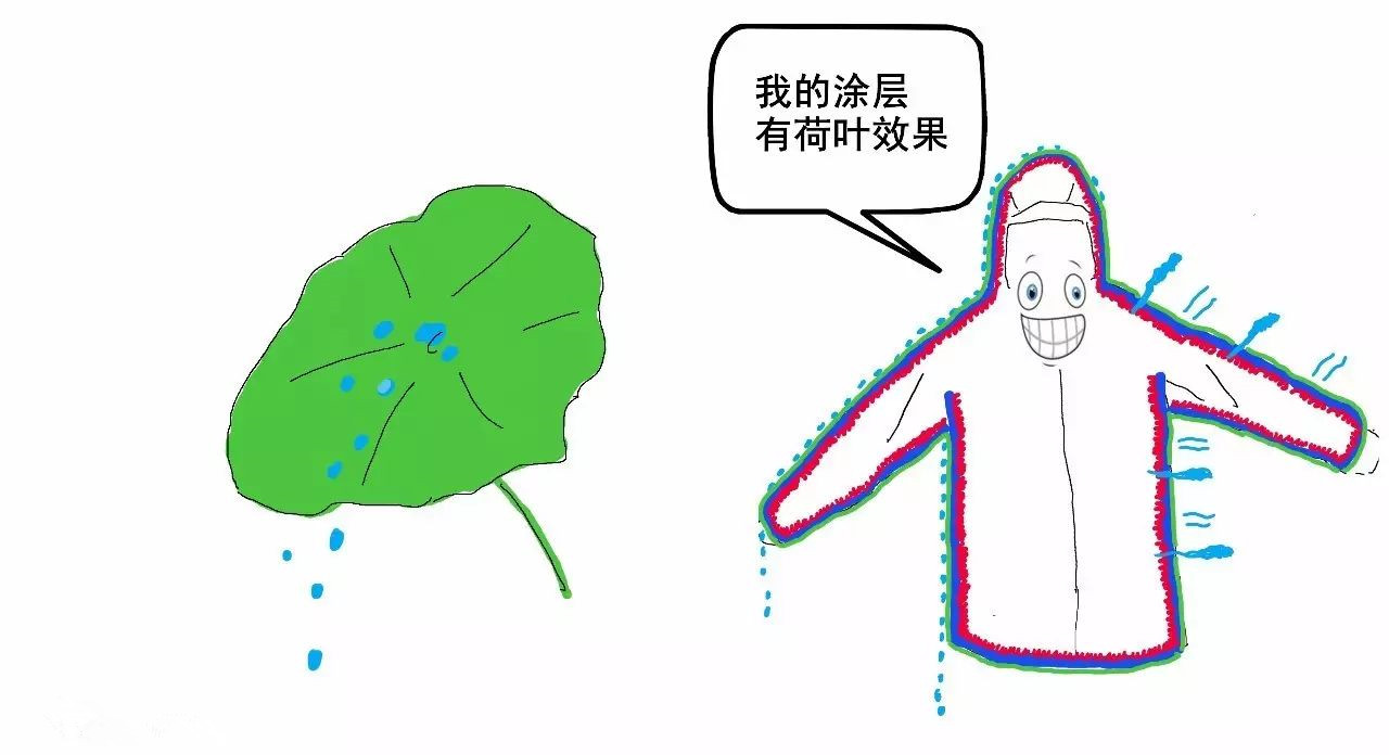 涂層可以實現(xiàn)“荷葉效果”,讓水珠滾落,同時水蒸氣能從面料縫隙排出。