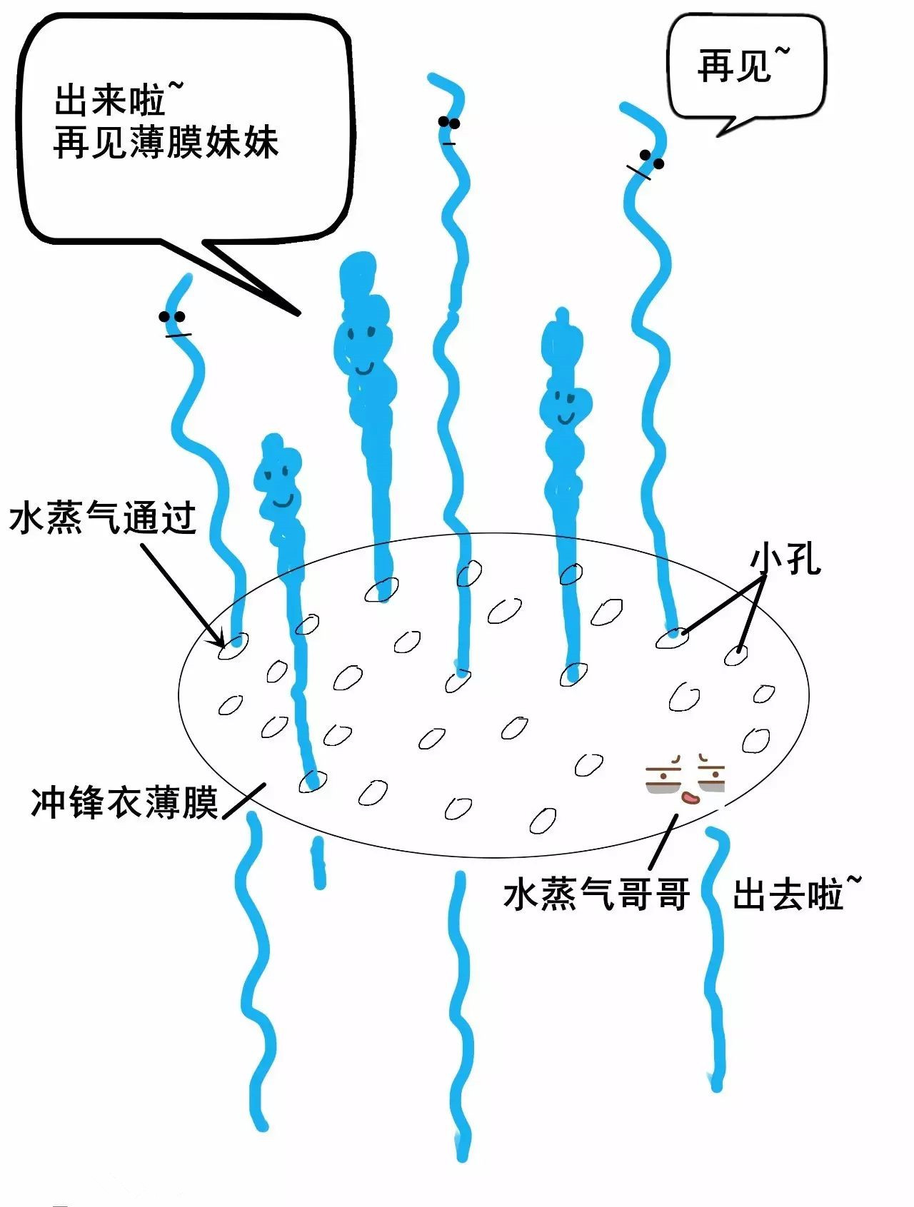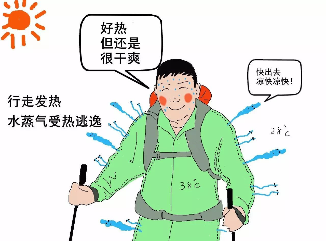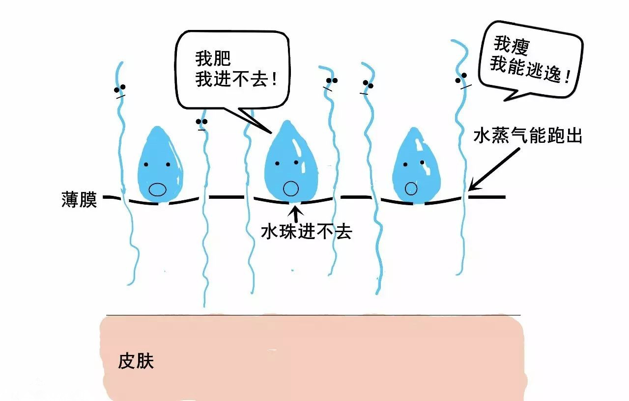 2)因為水蒸氣比水珠小很多,水蒸氣很細(xì)小,可以鉆過沖鋒衣薄膜的小孔排出。