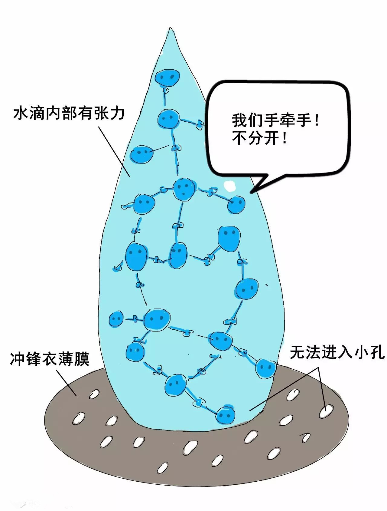 1)水滴內(nèi)部的張力讓它無法進(jìn)入薄膜。因為雨滴的“張力”很強(qiáng),水分子之間強(qiáng)烈吸引,就像抱團(tuán)在一起。當(dāng)雨滴接觸薄膜時,沒有水分子愿意離開水滴。