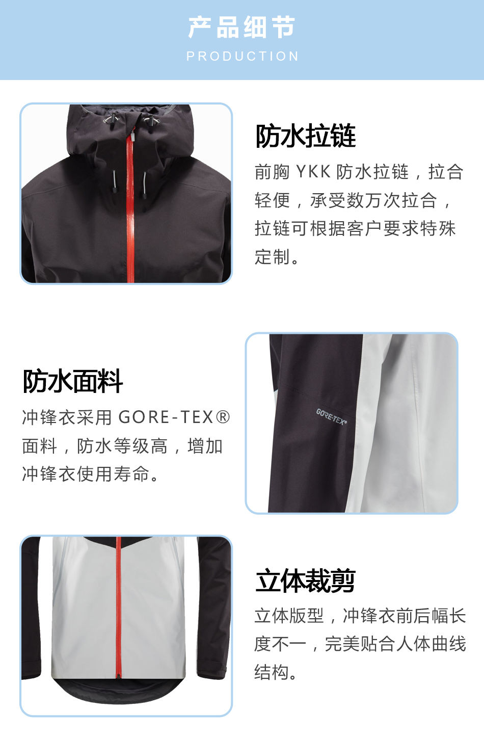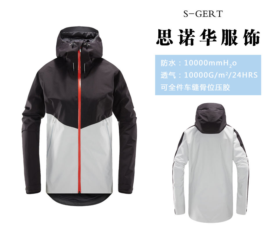 • 防水面料單層沖鋒衣加工采用GORE-TEX?面料,防水等級高,增加沖鋒衣使用壽命。