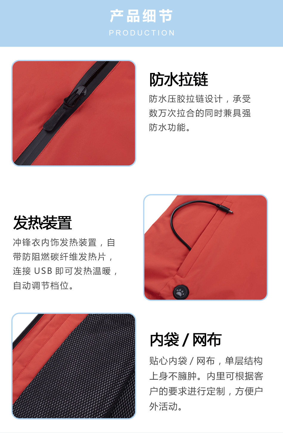 發(fā)熱裝置:沖鋒衣內(nèi)設(shè)發(fā)熱裝置,自帶防阻燃碳纖維發(fā)熱片,連接USB即可發(fā)熱溫暖,自動(dòng)調(diào)節(jié)檔位。