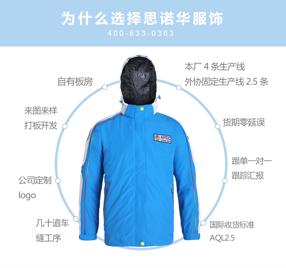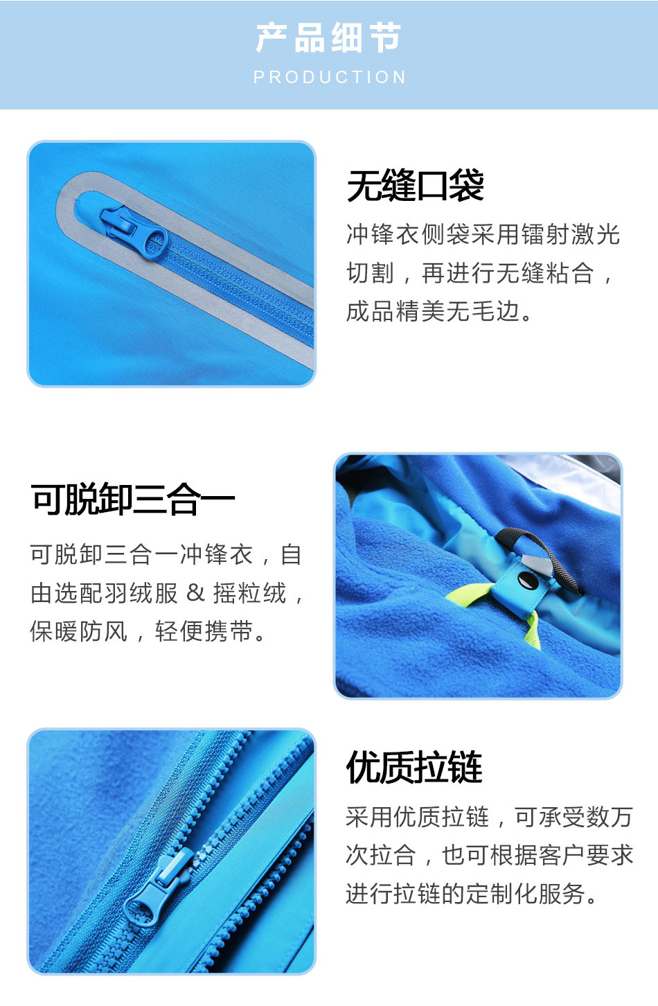 可脫卸沖鋒衣:可脫卸沖鋒衣定制,自由選配羽絨服&搖粒絨,保暖防風(fēng),輕便攜帶。