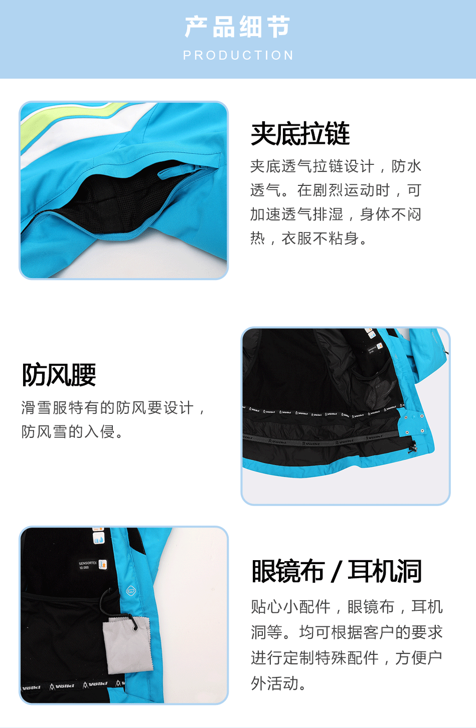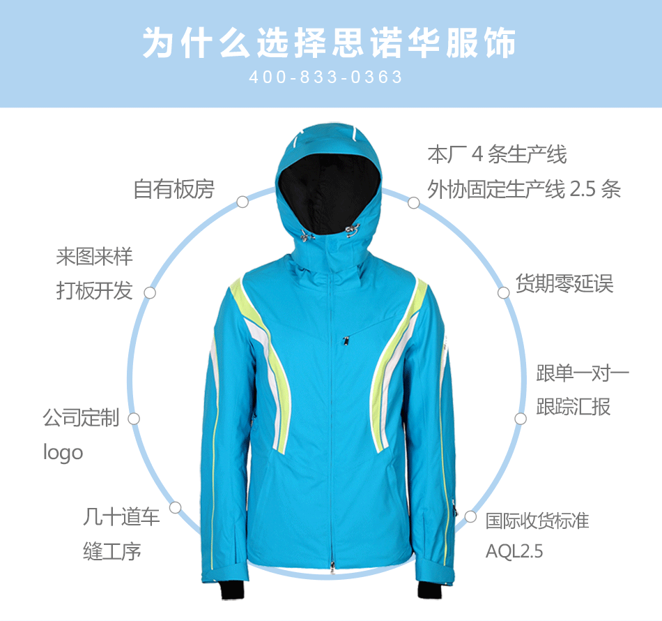 防水拉鏈采用無縫壓膠防水拉鏈激光熱封工藝貼合,面料采用進(jìn)口防水透氣涂層膜,使防水透氣膜與面料完美結(jié)合。可根據(jù)客戶需求生產(chǎn)加工沖鋒衣。