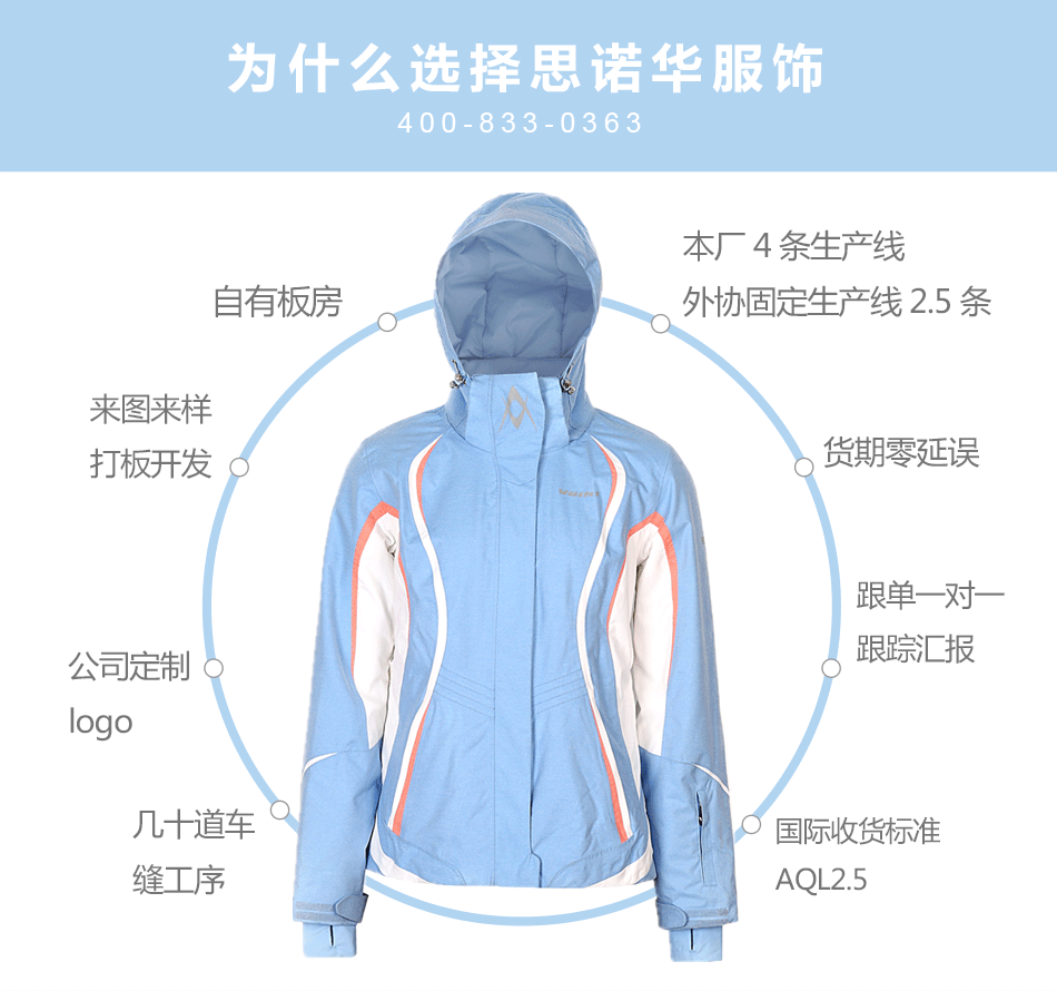 防水拉鏈采用無縫壓膠防水拉鏈激光熱封工藝貼合,面料采用進口防水透氣涂層膜,使防水透氣膜與面料完美結合。可根據(jù)客戶需求完成戶外沖鋒衣定制。