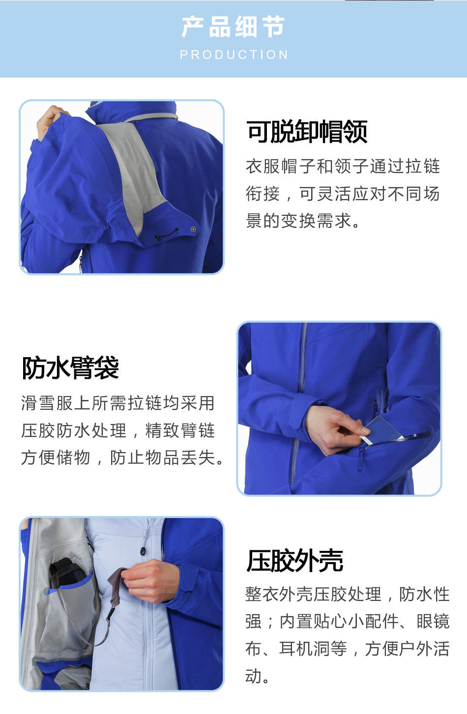 壓膠外殼:壓膠滑雪服加工整衣外殼壓膠處理,防水性強;內(nèi)置貼心小配件、眼鏡布、耳機洞等,方便戶外活動。