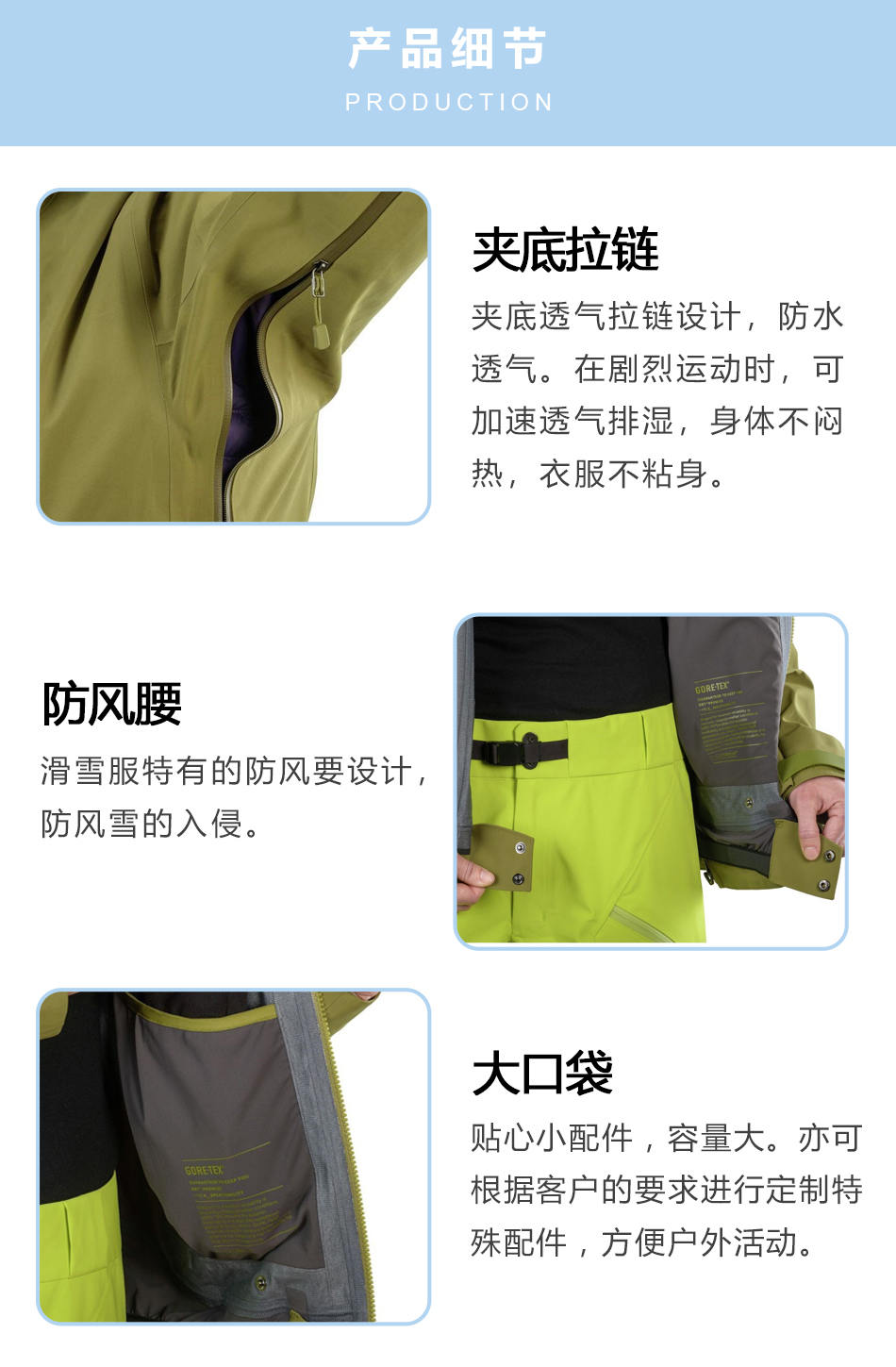 防風腰:滑雪服特有的防風腰設計,防風雪的入侵。