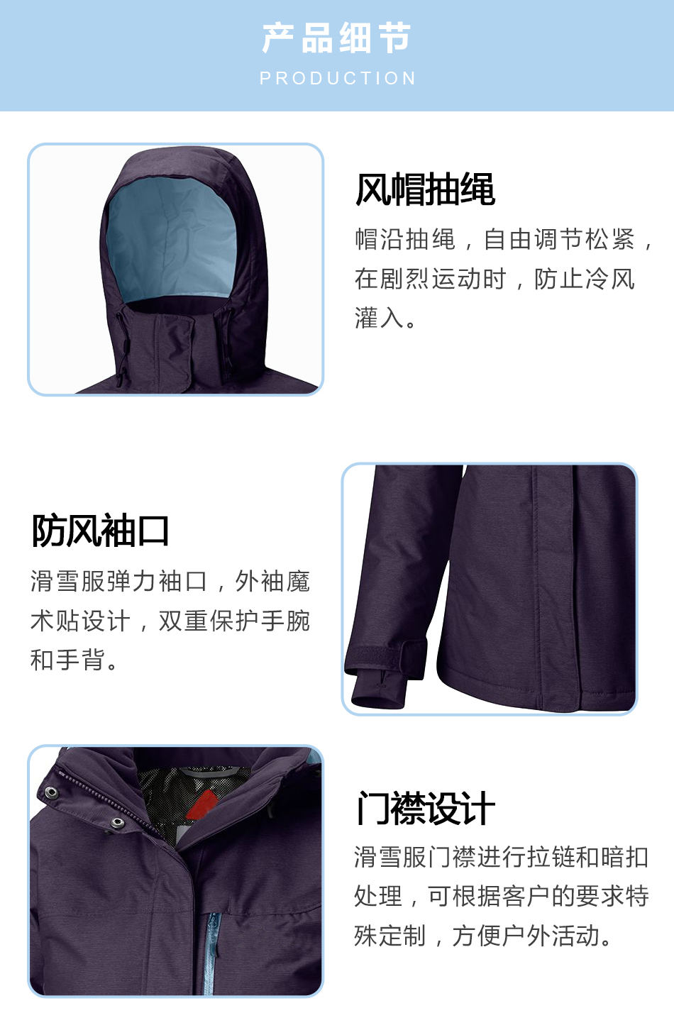 門襟處理:滑雪服生產(chǎn)的門襟進(jìn)行拉鏈和暗扣處理,可根據(jù)客戶的要求特殊定制,方便戶外活動(dòng)。